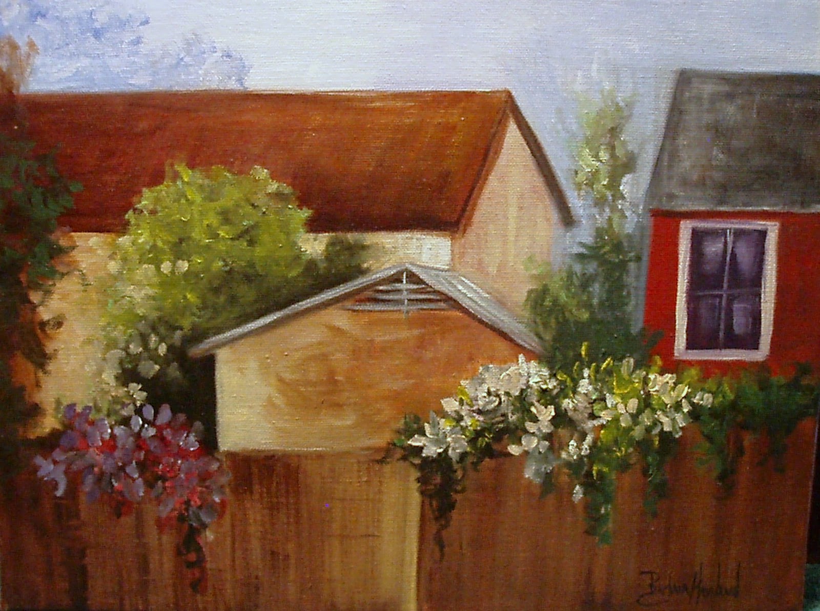 I set up on my front porch and painted this painting. It is the across the way from my porch. I added the flowers as the bush was a little scrawny.Overall, I am pleased with how it came out. An ordinary scene came out pretty. It is available here on my Landscape section.