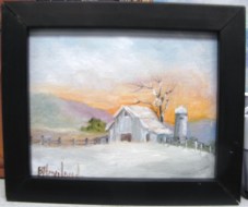 This miniature snow scene with a barn is framed and ready for gift giving. The painting is done in oils and is signed by me Barbara Haviland