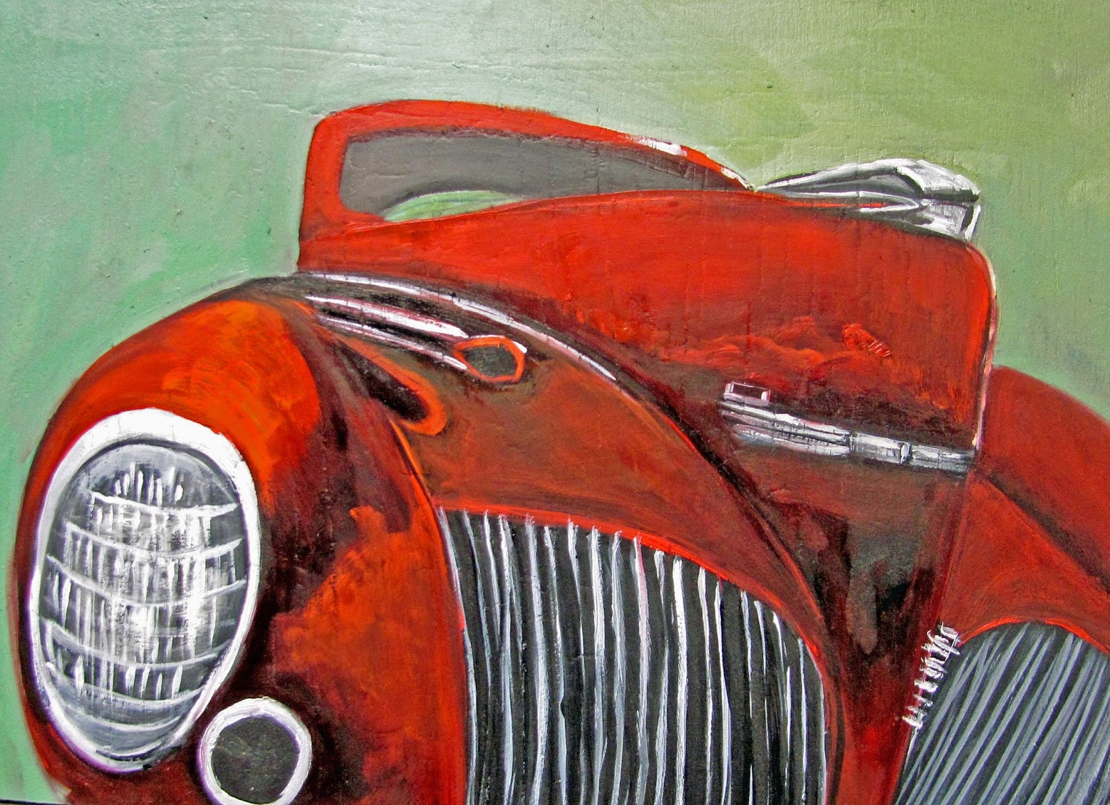 Here we have another old vehicle to show. Red Sedan done in oils