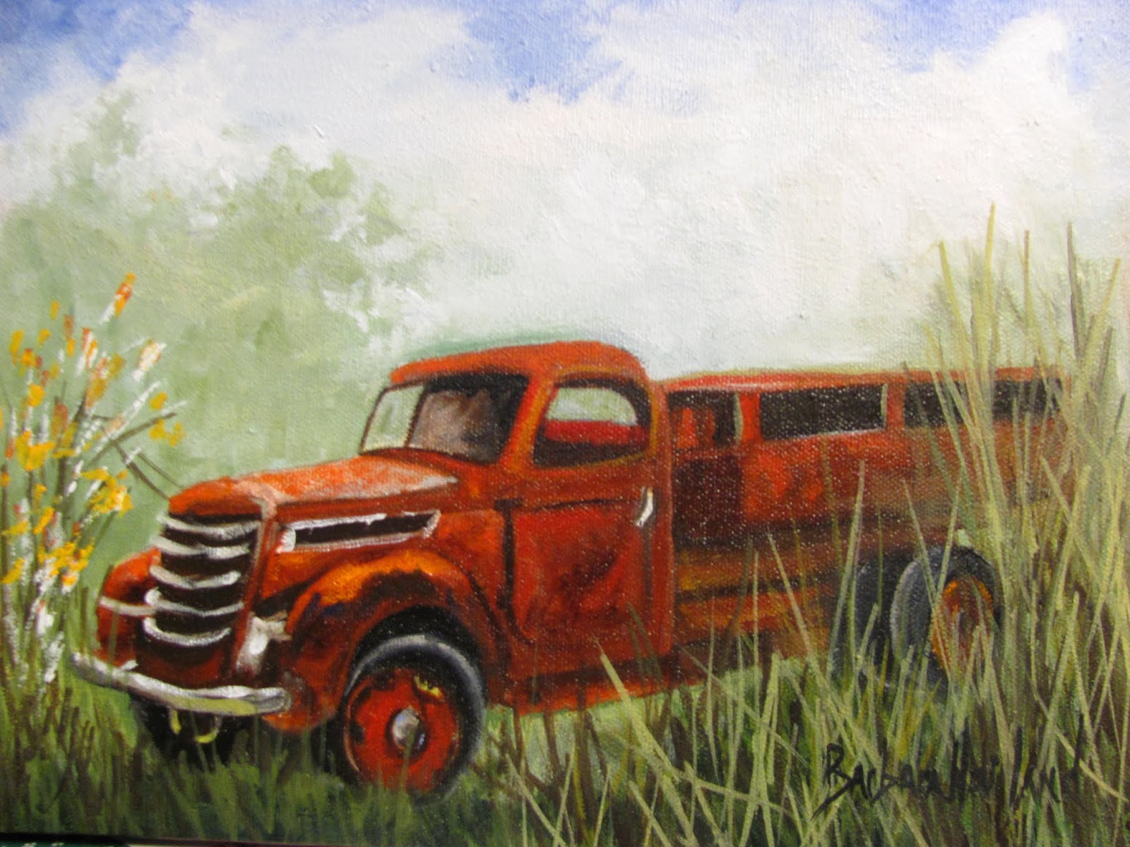 I found this old rusty red truck while in Montana. What a beautiful state. Anyway, I wanted to paint it and here it is. It is done in oils and is offered to you.