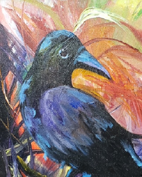 This Raven was done in oils on a colorful background. It is signed and ready to go home with you.