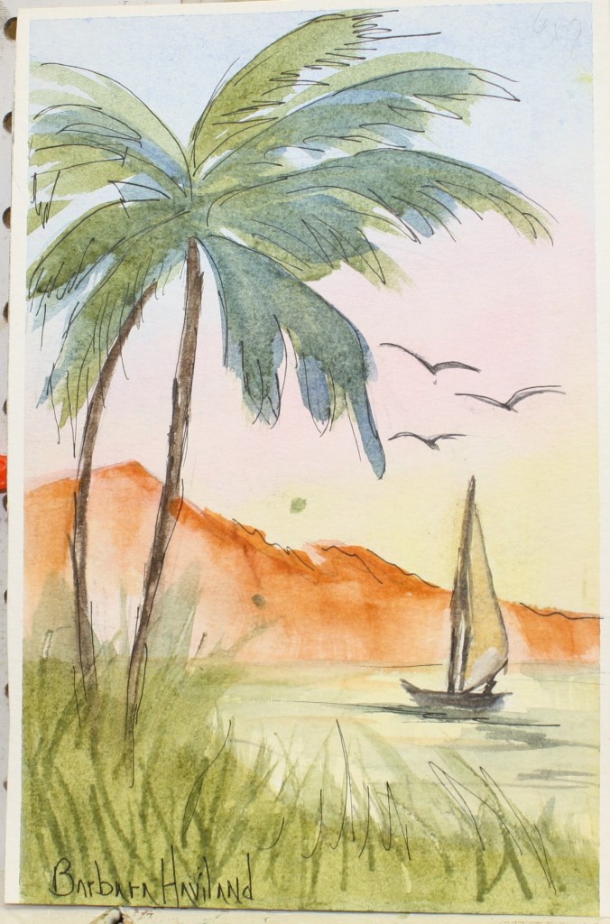 #boat,#sailing,#palmTree,#watercolor,#birds,#Handpainted,#BarbaraHavilandFineArt.com
