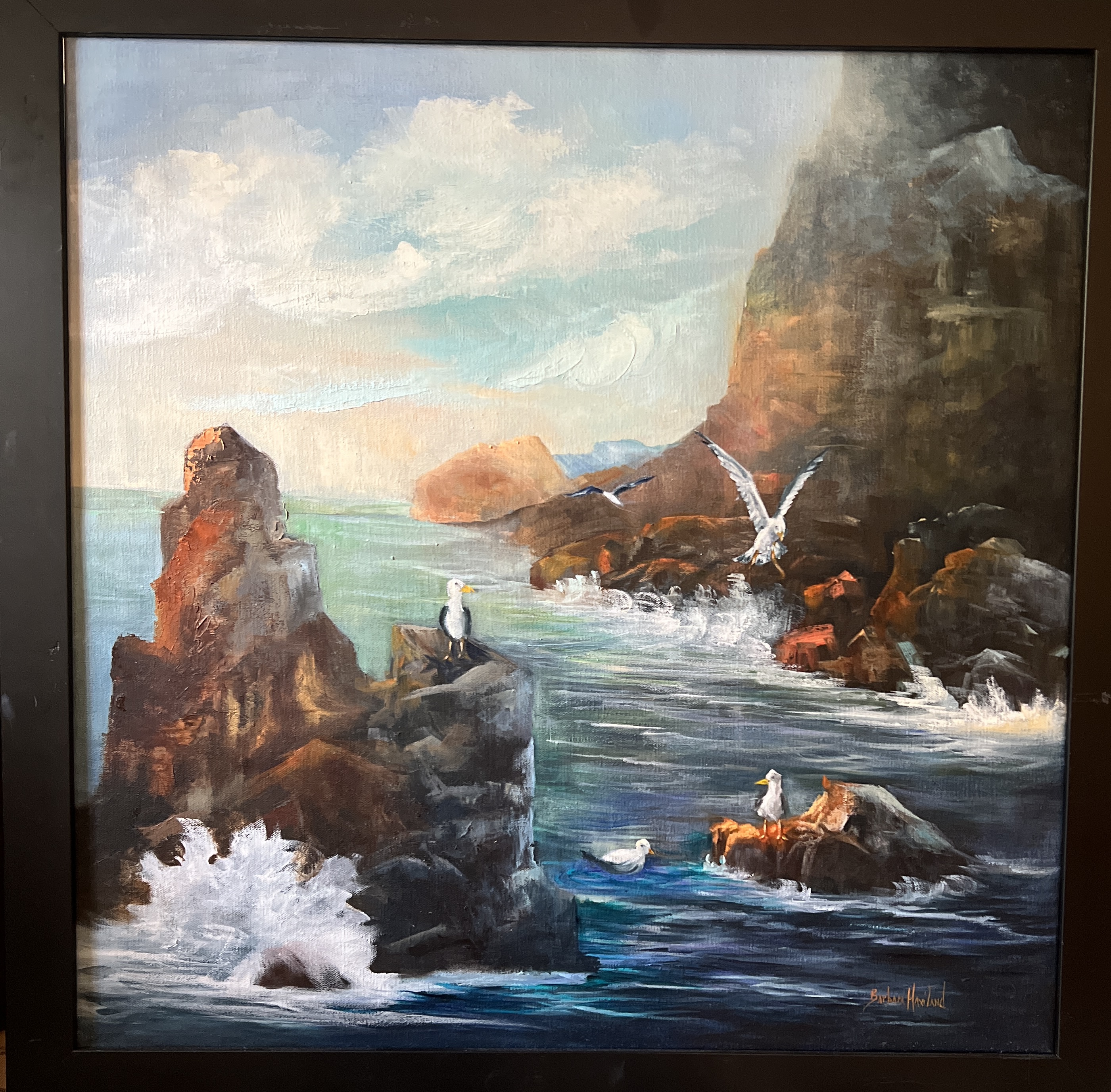 Sea Gulls on Rocky California Coast was done from photos taken on Hwy 1 near the coast of California. It is a large oil painting and is framed. I have used my knife for the rocks. It measures 29″x 33″ including the frame. It is hanging in our home right now.