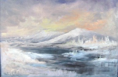 I did this snow painting on a black canvas. The painting measures 16″x12″ and is framed with a black frame.